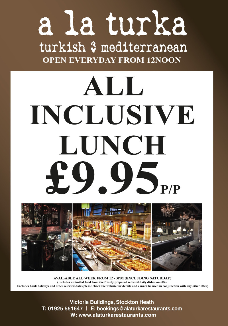 Join us for our £9.95 all inclusive lunch offer available Sunday-Friday 1200-1500. Includes unlimited food from our freshly prepared selected daily dishes on offer.