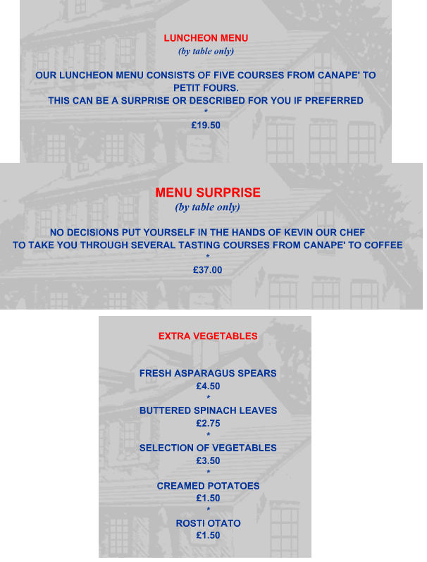 The cuisine is French based and the tempting 'a la carte' menu is enhanced by the now famous 'Menu Suprise', consisting of seven courses - from canapes to coffees. Daily dishes are also offered from market opportunites as they occur throughout the year.